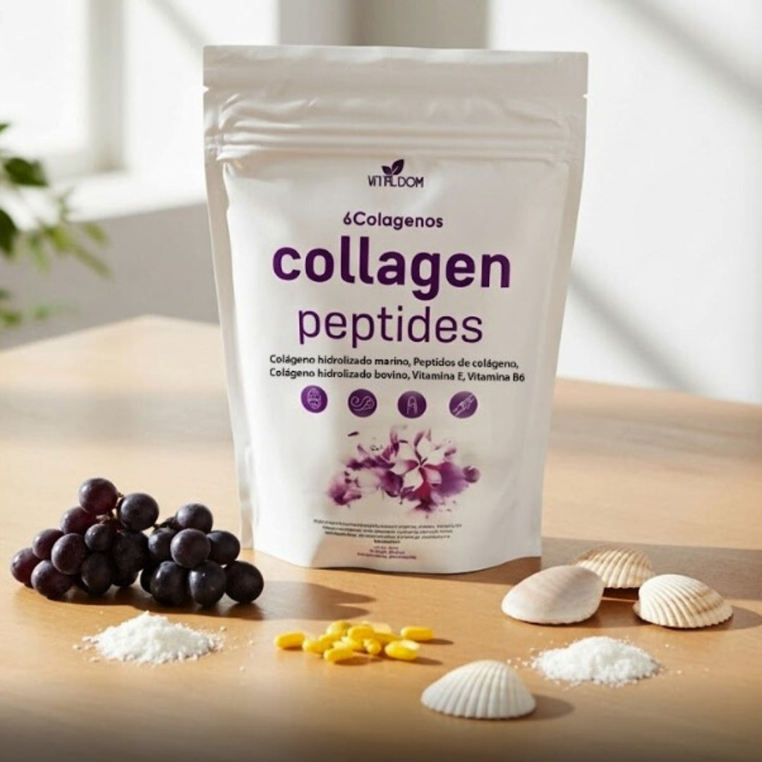 Fórmula avanzada con colágeno marino y bovino, vitaminas E y B6. Ayuda a mantener una piel más joven y radiante, fortalece el cabello y las uñas, y promueve la regeneración